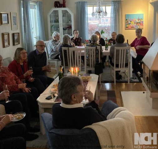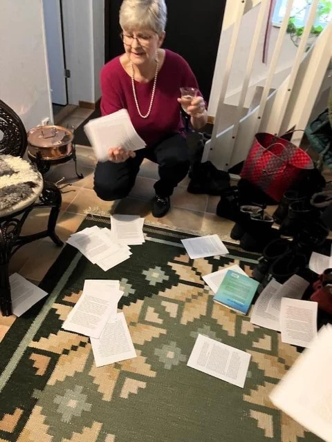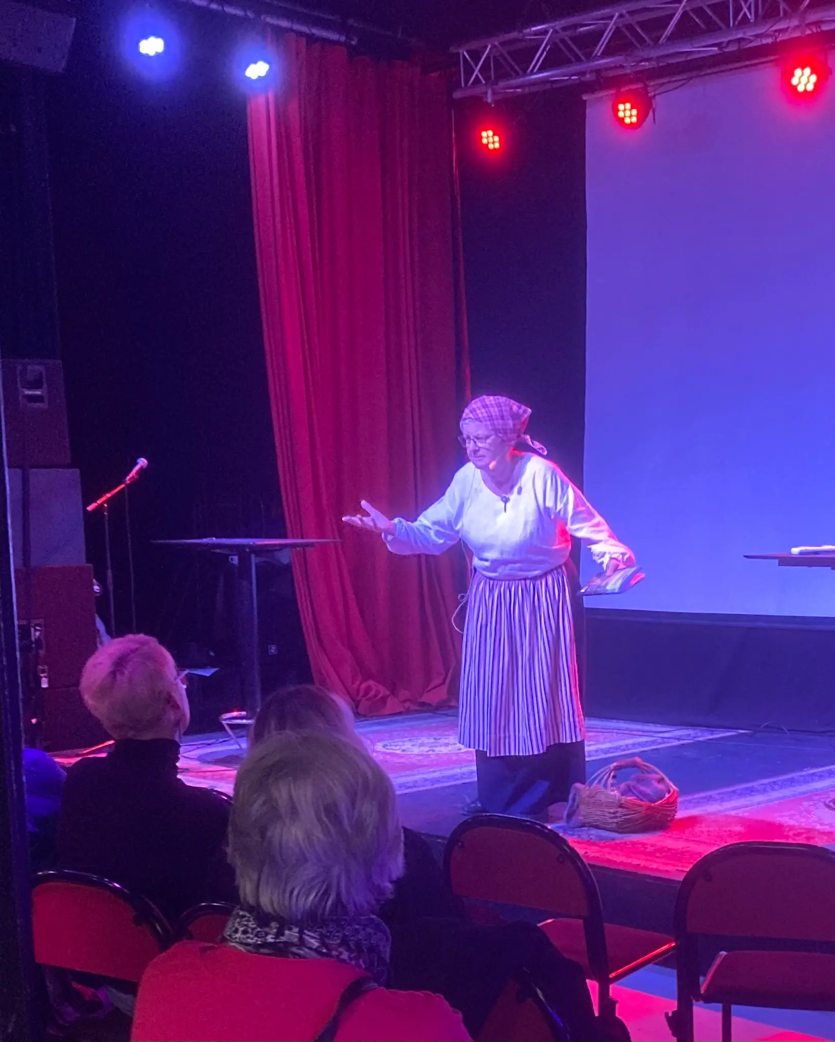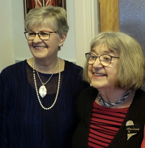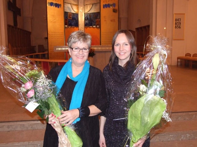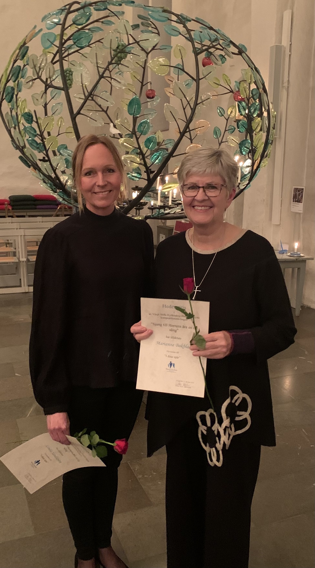 Marianne Bokblad och Marianne Wik förklarar för publiken vem som är vem med sånger, dikter och spex.