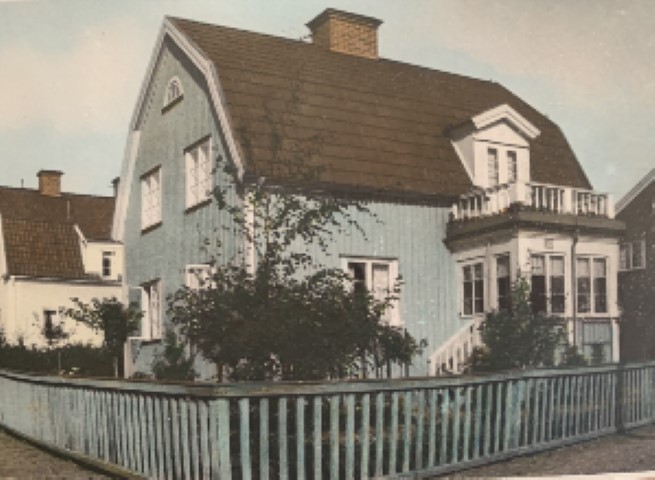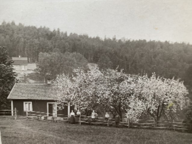 Gustafs barndomshem, Sågartorpet, i utkanten av Norrahammar. Mamma Ruth till vänster och pappa Albert till höger. Bertha med lillebror Lennart och Gustaf och Eric. Bilden bör vara tagen 1922.