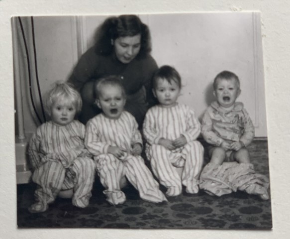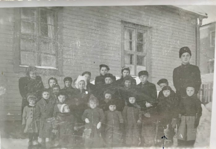Den enda bild som finns på barnen i den grupp med finska flyktingar, 40 personer, som Gustaf fick ta hand om en vecka efter sin ankomst till Vilhelmina. 20 våningssängar fick plats i armélokalen. Till vänster Astrid Hagneryd, (Ester i boken, senare boende i Söderköping) hjälpte till och Gustafs assistent Rude Ström står till höger. Pojken vid pilen är Esko.
